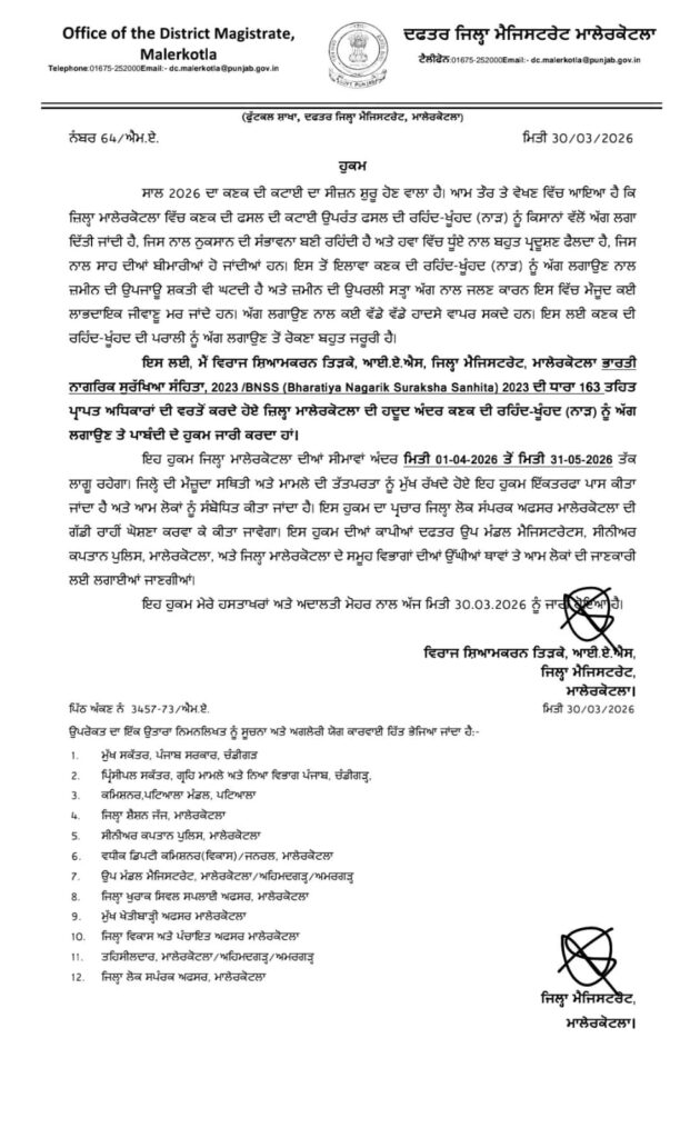 ਜ਼ਿਲ੍ਹਾ ਮੈਜਿਸਟਰੇਟ ਵਿਰਾਜ ਐਸ. ਤਿੜਕੇ ਵਲੋਂ ਭਾਰਤੀ ਨਾਗਰਿਕ ਸੁਰੱਖਿਆ ਸੰਹਿਤਾ, 2023 ਦੀ ਧਾਰਾ 163 ਦੇ ਤਹਿਤ ਪ੍ਰਾਪਤ ਹੋਏ ਅਧਿਕਾਰਾਂ ਦੀ ਵਰਤੋਂ ਕਰਦੇ ਹੋਏ ਜ਼ਿਲ੍ਹੇ ਦੀ ਹਦੂਦ ਅੰਦਰ ਕਣਕ ਦੀ ਰਹਿੰਦ- ਖੂੰਹਦ (ਨਾੜ) ਨੂੰ ਅੱਗ ਲਗਾਉਣ ਤੇ ਪਾਬੰਦੀ ਲਗਾਈ ਗਈ ਹੈ।